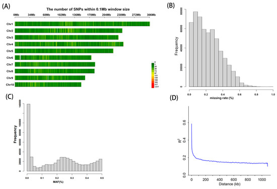 Attenuation map of genotype diversity and LD. (A) Chromosome-specific SNP density within 1-Mb intervals. The range of number of SNPs is indicated by a green to red scale. (B) Frequency distribution of missing data points of SNPs. (C) Distribution of minor allele frequency (MAF) of the RILs. (D) Genome-wide LD decay (r2) over physical distance (Kb) across all the chromosomes in 442 maize RILs.