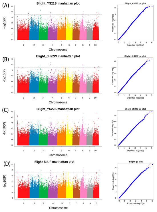 Manhattan map (left) and Q–Q plots (right) of YS21 (A), JH22 (B), YS22 (C), BLUP (D) show SNPs associated with BLSB resistance. Each dot on the left figures represents an SNP, and the black line represents the threshold of <1 × 10−4. Different colors represent different chromosomes The red lines on the right figures are the trend lines to which the ideal Q–Q plot in each case should correspond.