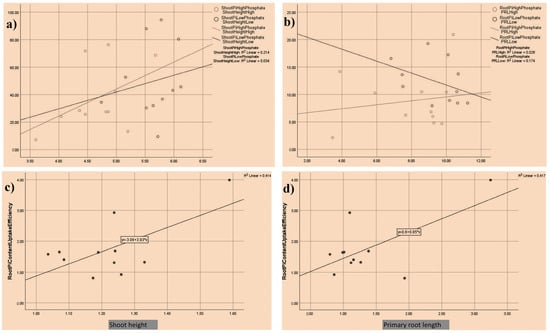 Correlation between traits analyzed. A linear correlation between shoot height and shoot inorganic phosphate content under the control (40 ppm) and low phosphate conditions (LP, 4 ppm) (a), primary root length (PRL) and root inorganic phosphate content in high (control) and low phosphate conditions (b), root iP content uptake efficiency and shoot height (c), and root iP content uptake efficiency and primary root length (PRL) (d).