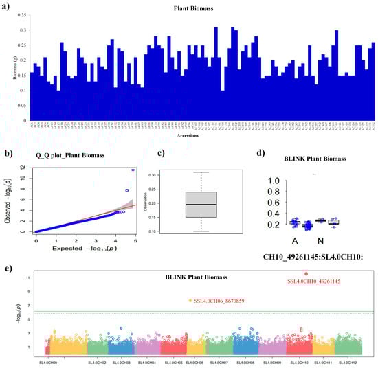 Plant biomass (PB) under the control showed diversity in the tomato panel (Figure 3a). The Manhattan plot showed that two significant SNPs, viz. SNP SSL4.0CH10_49261145 and SSL4.0CH06_8670859 were located on chromosomes 10 and 6 above the threshold line (Figure 3b). The Q-Q plot showed the behavior of the PB trait in terms of expected and observed log values (Figure 3c). Similarly, the whisker plot showed the behavior of SNPs identified for PB trait among a panel of tomato accessions in the control condition (Figure 3d). The distribution of significant SNP on the chromosomes is shown in Figure 3e. The tomato panel under low P conditions (LP) analyzed using the GWAS procedure showed no significant SNPs above the threshold line, so no further analysis was performed.