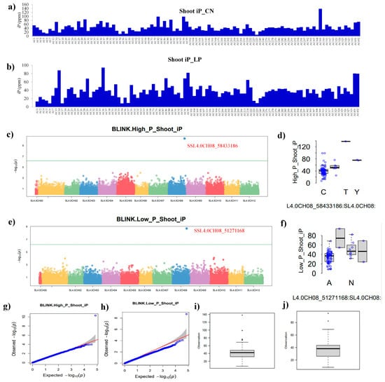 For shoot inorganic phosphate (SiP), variation in the tomato panel was observed under the control and LP conditions (Figure 4a,b). The Manhattan plot of SiP under the control conditions showed a single SNP above the threshold line (Figure 4c), while the distribution of significant SNPs on chromosome 8 is provided (Figure 4d). The BLINK model of the GWAS provided one significant SNP SSL4.0CH08_58433186 localized on chromosome 8. The Q-Q and whisker plots provided information about the behavior of the SiP trait in the tomato panel under the control conditions (Figure 4g–i). For SiP under the LP conditions, the tomato panel showed huge diversity in terms of the iP content (Figure 4b). The BLINK provided a single SNP, viz. SSL4.0CH08_51271168, localized on chromosome 8. The Manhattan plot showed a single SNP above the threshold line (Figure 4e). The distribution pattern of significant SNPs under the LP conditions on chromosome 8 is shown in Figure 4f. The Q-Q and whisker plot showed the behavior of the SiP trait under the LP conditions in the tomato panel (Figure 4h–j).