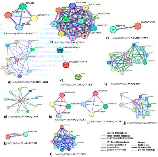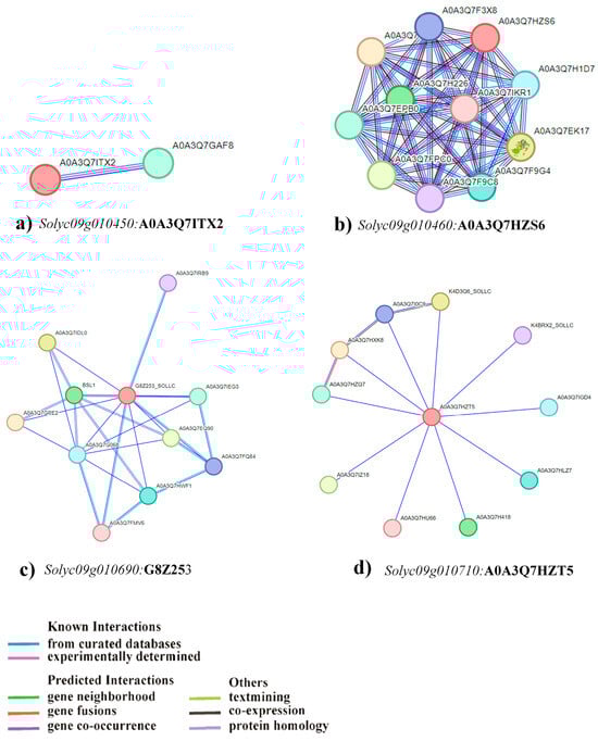 For RiP under the LP conditions, the CDS of Solyc09g010450 spans 2301 base pairs, encoding 766 amino acid residues. The transcript comprises a single exon and is annotated with 47 domains, linked to 1509 variant alleles, and mapped to 25 oligo probes (Table 2). According to predictions derived from the STRING database, one protein has been identified as a potential interactor with Solyc09g010450, potentially involved in regulating P uptake (Figure 7a). The CDS of Solyc09g010460 spans 4506 base pairs, directing the synthesis of 956 amino acid residues. Moreover, the transcript is composed of 15 exons, annotated with 30 domains, linked to 1973 variant alleles, and aligned with 22 oligo probes (Table 2). The STRING database showed that proteins encoded by this gene could interact with ten proteins that have been indicated as potential interactors with Solyc09g010460, potentially participating in the regulation of P uptake (Figure 7b). Solyc09g010690 contains a CDS spanning 1843 base pairs, facilitating the encoding of 451 amino acid residues. This transcript structure comprises eight exons, annotated with 29 domains, correlated with 1737 variant alleles, and correspondingly linked to 29 oligo probes (Table 2). As per the predictions extracted from the STRING database, ten proteins have been indicated as potentially interacting with Solyc09g010690, contributing to the regulation of P uptake (Figure 7c). The Solyc09g010710 exhibited a CDS of 1350 base pairs, encoding 304 amino acids within a five exon. Annotated with eight domains, associated with 1447 variant alleles, and mapped to 22 oligo probes, its EXPRESSED PROTEIN domain could contribute to RiP uptake under low P conditions by interacting with high-efficiency transcription factors (Table 2). STRING predictions identified ten potential proteins interacting with Solyc09g010710 (Figure 7d).