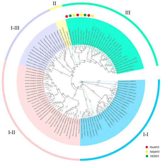 It has been pointed out that three whole-genome duplication (WGD) events occurred in banana during the evolutionary process, namely the α, β (about 70 million years ago) and γ events (about 100 million years ago) [36]. The duplication event between banana MaD53 and MbD53 genes occurred from 3.3939–56.9012 Mya after the α event, while the A and B genomes diverged at a very close time of about 5.4 Mya [37]. It is hypothesised that the banana A genome underwent a gene-doubling event when it underwent the three WGD events, which resulted in three MaD53 genes in the A genome. The A and B genomes had begun to diverge by the time the MaD53 and MbD53 gene duplications occurred, and therefore, there were also three MbD53 genes in the B genome after complete divergence. Musa itinerans is the same AA-type diploid wild species, and the duplication between MaD53 and MiD53 genes was also after three WGD events, but only two MiD53 genes exist in its genome at present, and it is presumed that the MiD53 gene was doubled and then lost. The same loss of the D53 gene occurred in both monocotyledonous and dicotyledonous plants. Aquilegia coerulea is a tetraploid plant whose ancestral palaeotetraploidisation occurred after the divergence of the columbine from the opium poppy [38]. There are eight D53 genes in the opium poppy, whereas only one D53 gene is found in the columbine, suggesting that a loss event of the D53 gene in the columbine may have occurred, as well.