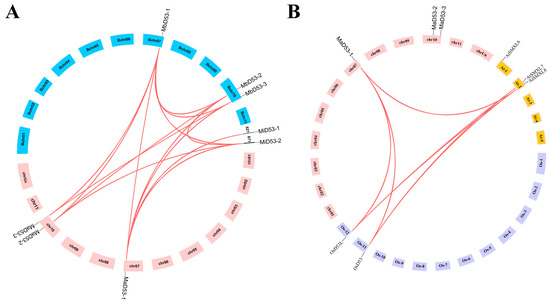 The co-linear distributions of D53 gene in banana. (A) The co-linear distribution of banana MaD53, MbD53 and MiD53 genes. (B) The co-linear distribution of banana, rice and Arabidopsis D53 genes. The line indicates the segmental replication gene pair of D53 in banana.