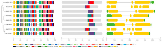 The exon–intron structure of the banana D53 gene was analysed, and it was found that the MiD53 gene had the highest number of exons and introns (Figure 3), about twice as many as MaD53 and MbD53. MaD53 and MbD53 had only three exons and two introns, except for MbD53-2, which had four exons and three introns.