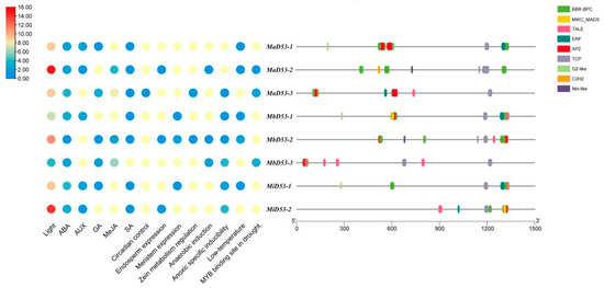 TBtools was used to extract 1500 bp upstream of the transcription start site of the D53 gene from the banana genome file and submitted to PlantCARE [63] (http://bioinformatics.psb.ugent.be/webtools/plantcare/html/, accessed on 4 September 2023) and PlantTFDB [64] (http://planttfdb.cbi.pku.edu.cn/, accessed on 5 September 2023) online websites (with parameters set to p-value ≤ 1 × 10−6) for prediction of its promoter cis-acting elements and transcription factor binding sites. The results obtained were collated and plotted visually using TBtools.