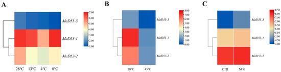 To understand the expression of the MaD53 gene under various abiotic stresses, the FPKM values of the MaD53 gene were extracted from the transcriptomic data of high temperature “Tianbaojiao”, different low temperatures of “Sanmingyeshengjiao” and “Grande Naine” Cavendish osmotic stress to plot a heatmap (Figure 5). Under different low-temperature treatments, the expression of MaD53-1 and MaD53-2 decreased and then increased, reaching a minimum at 4 °C, and the expression of MaD53-3 decreased continuously. Compared with the 28 °C control, the expression of MaD53 was substantially decreased under high-temperature treatments. However, the expression of MaD53 was only slightly up-regulated under osmotic stress. It can be seen that both high and low-temperature stresses have a large effect on the expression of MaD53-1 and MaD53-2, while MaD53-3 may have a smaller effect because of its relatively low expression in the plant.