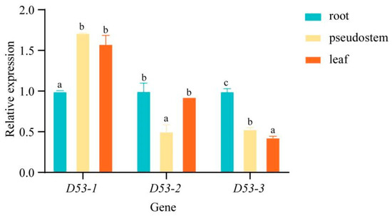 In order to investigate the specific expression pattern of MaD53 genes in “Yinni Dwarf”, the expression of three MaD53 genes was analysed in different tissues using UBQ2 as an internal reference gene (Figure 6). The three MaD53 genes were expressed in banana roots, pseudostems and leaves, and they were widely involved in the growth and development of banana. The expression of MaD53 genes and their expression patterns were different in different parts of banana, among which MaD53-1 was significantly higher in pseudostem and leaves than in roots. The expression of MaD53-2 was highest in roots, followed by leaves and, finally, pseudostems. MaD53-3 was not highly expressed in roots, pseudostems and leaves, and its expression was significantly lower in both pseudostems and leaves than in roots.