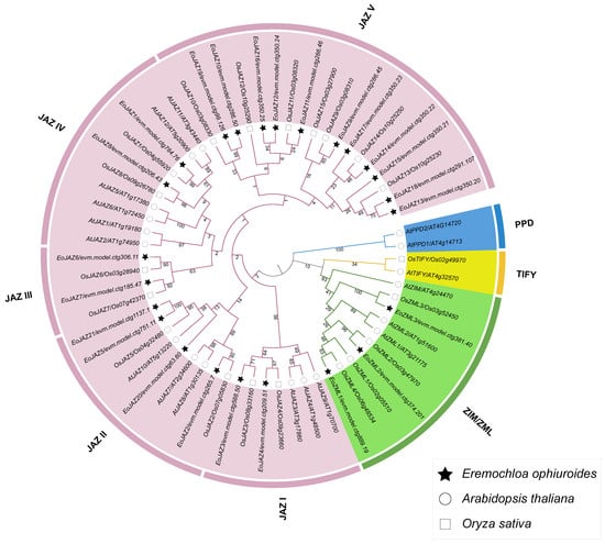 Phylogenetic relationships of the TIFY proteins from E. ophiuroides, Arabidopsis, and O. sativa.