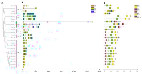Phylogenetic relationships, gene structure, and conserved motif of the E. ophiuroides TIFY gene family. (A) The phylogenetic relationships of the E. ophiuroides TIFY family. (B) Exon–intron structure and the characteristic domain distribution of the E. ophiuroides TIFY genes. (C) Distribution of the conserved motifs in E. ophiuroides TIFY proteins.