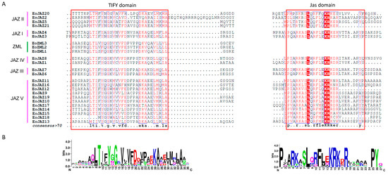 Alignments of TIFY and Jas domain sequences and the sequence logos of the TIFY family members in E. ophiuroides. (A) Multiple sequence alignments of E. ophiuroides TIFY family members. The conserved TIFY or Jas domain is boxed in red, and the red background colors in the boxes indicate the sequence consistency of 100%, while the blue squares indicate the sequence identity above 75% with the conserved sequence symbols displayed in red font. (B) Sequence logos of TIFY and Jas domains.