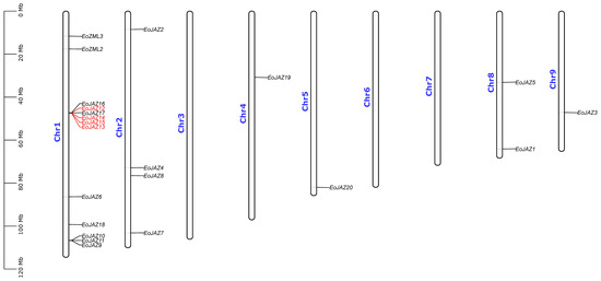 Distribution of the EoTIFY genes on E. ophiuroides chromosomes. The red font represents the tandem gene duplication. The chromosome numbers are indicated at the left side of each chromosome image. The scale on the left is in million bases (Mb).