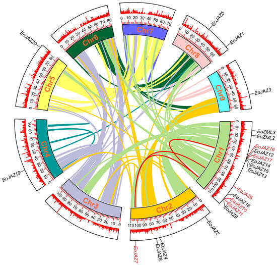 Colinear region of the E. ophiuroides TIFY genes. The colored lines represent all the colinear blocks in the E. ophiuroides genome, and the red lines represent TIFY gene pairs subjected to segmental duplication. Chromosome numbers are shown at the center of each chromosome.