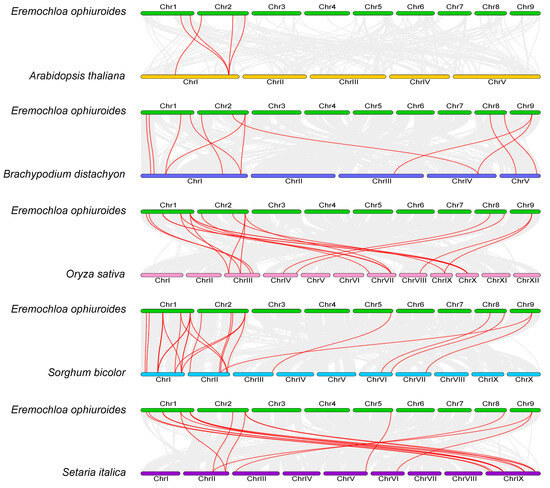Synteny analysis of TIFY genes between E. ophiuroides and Arabidopsis thaliana, Brachypodium distachyon, Oryza sativa, Sorghum bicolor, and Setaria italica. Gray lines in the background indicate the collinear blocks within E. ophiuroides and other plant genomes, while the red lines highlight the syntenic TIFY gene pairs.