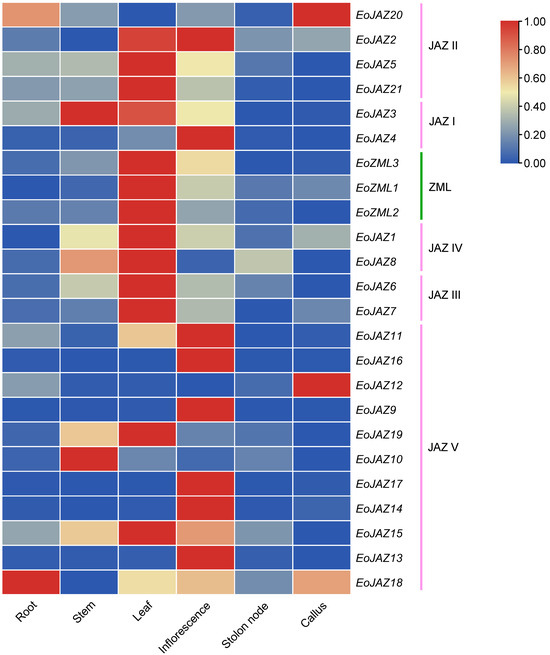 The expression patterns of the EoTIFY family genes in various tissues (root, stem, leaf, inflorescence, stolon node, and callus) were investigated by qRT-PCR analysis (Figure 7, Supplementary Table S5, and Figure S1). For the JAZ II subgroup (EoJAZ20, EoJAZ2, EoJAZ5, and EoJAZ21), a higher expression level of EoJAZ5 and EoJAZ21 was found in leaf, inflorescence, root, and stem tissues. However, the genes EoJAZ20 and EoJAZ2 showed distinct tissue expression patterns, with the EoJAZ2 gene having the highest expression in inflorescences, but EoJAZ20 being highly expressed in callus and root tissues. Although there are only two members in the JAZ I subgroup (EoJAZ3 and EoJAZ4), a different tissue expression pattern were detected for them. The EoJAZ3 was highly expressed in stem, leaf, and inflorescence tissues, but the EoJAZ4 only showed the highest expression in inflorescences. For the ZML subgroup, all the three genes (EoZML1, EoZML2, and EoZML3) showed significantly tissue-specific expression in leaves and were expressed more highly in inflorescences than in other tissues. A similar leaf-specific expression pattern could also be found in the JAZ IV (EoJAZ1/EoJAZ8) and JAZ III (EoJAZ6/EoJAZ7) subgroup genes; and meanwhile, the EoJAZ1, EoJAZ8, and EoJAZ6 genes showed relatively low levels of expression in stems, and EoJAZ8 also exhibited a relatively low expression in stolon nodes. For the JAZ V subgroup, the tissue expression patterns of all gene members were diverse. Five genes (EoJAZ16, EoJAZ9, EoJAZ17, EoJAZ14, and EoJAZ13) displayed tissue-specific expression only in inflorescences, while the three genes EoJAZ11, EoJAZ15, and EoJAZ18 showed the highest expression in inflorescence, leaf, and root tissues, respectively. As for EoJAZ19 and EoJAZ10, although both genes were highly expressed in stems, EoJAZ19 had the highest expression level in leaves and EoJAZ10 showed the highest level of expression in stem tissues. In addition, except for EoJAZ18 presenting the highest level of expression in root tissues, the genes EoJAZ11, EoJAZ12, and EoJAZ15 were also detected at relatively low levels of expression in root tissues. Specifically, the genes EoJAZ12 and EoJAZ18 were also detected as highly expressed in callus tissues.