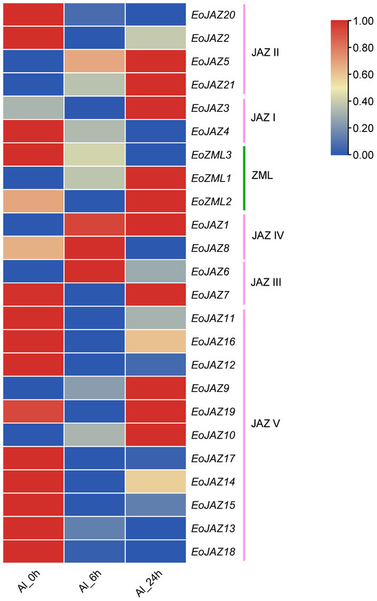 The expression pattern of the EoTIFY family genes was also investigated under Al toxicity at three time points, i.e., before Al treatment (0 h), after a short time (6 h), and after a long time (24 h) of treatment. As shown in Figure 9, Supplementary Table S5, and Figure S3, members of the subfamily ZML showed different expression patterns in response to Al toxicity. EoZML1 showed a gradually increasing expression during the whole Al treatment from 0 to 24 h, while EoZML2 had a higher expression level only at 24 h of Al treatment. On the contrary, the expression level of EoZML3 decreased obviously under the Al stress. In the subfamily JAZ, only 8 JAZ genes out of 21 were found to be upregulated in response to Al treatment. Specifically, one JAZ gene in each of the two subgroups JAZ I (EoJAZ3) and JAZ III (EoJAZ6), and two JAZ genes in each of the three subgroups JAZ II (EoJAZ5 and EoJAZ21), JAZ IV (EoJAZ1 and EoJAZ8), and JAZ V (EoJAZ9 and EoJAZ10) exhibited obviously upregulated expression levels at a specific time point or during the whole stage of the Al stress, while the other thirteen JAZ genes from four subgroups including JAZ I, JAZ II, JAZ III, and JAZ V were downregulated during the whole period of or at a specific point of Al treatment. These highly induced TIFY family members, especially upregulated members in response to Al toxicity, might be good candidates for developing resistance against Al stress in E. ophiuroides.
