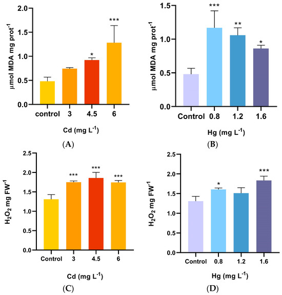 Changes in the (A,B) MDA and (C,D) H2O2 contents of shoots of A. pinifolia after 60 days of Cd (3, 4.5, and 6 mg L−1) or Hg (0.8, 1.2, and 1.6 mg L1) treatment. All values are means ± SD (n = 3). Significant differences at *** p < 0.001, ** p < 0.01, and * p < 0.05 as compared to the control (Tukey’s post hoc test); ns: not significant.