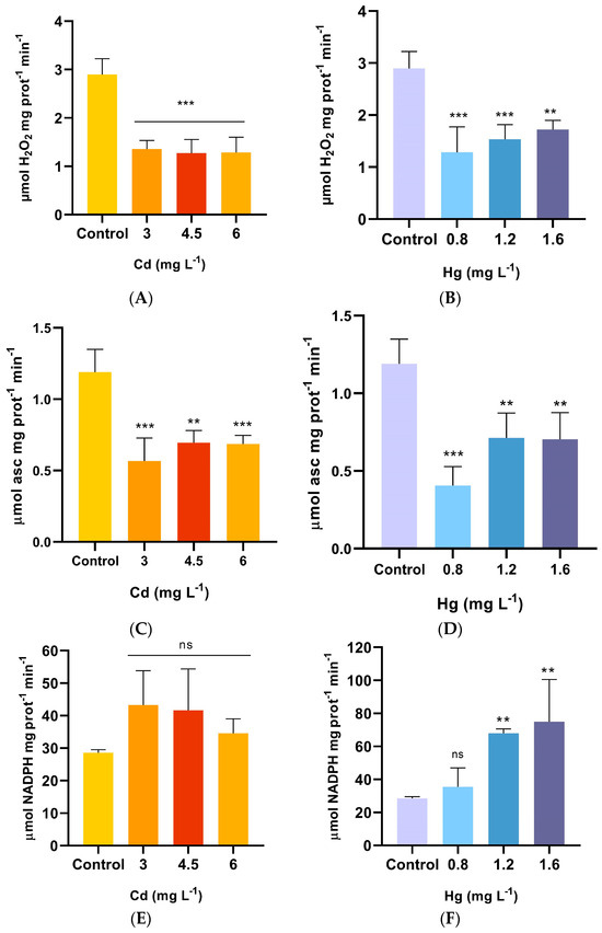 Effect of Cd and Hg on activity of (A,B) catalase (CAT), (C,D) ascorbate peroxidase (APX), and (E,F) glutathione reductase (GR) contents in shoots of A. pinifolia after 60 days of Cd (3, 4.5, and 6 mg L−1) or Hg (0.8, 1.2, and 1.6 mg L−1) treatment. All values are means ± SD (n = 3). Significant differences at *** p < 0.001, and ** p < 0.01 as compared to the control (Tukey’s post hoc test); ns: not significant.