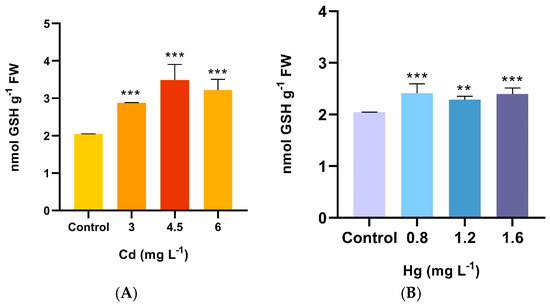 Glutathione (GSH) content in shoots of A. pinifolia aerial parts after 60 days of (A) Cd (3, 4.5, and 6 mg L−1) or (B) Hg (0.8, 1.2, and 1.6 mg L−1) treatment. All values are means ± SD (n = 3). Significant differences at *** p < 0.001 and ** p < 0.01 as compared to the control (Tukey’s post hoc test); ns: not significant.