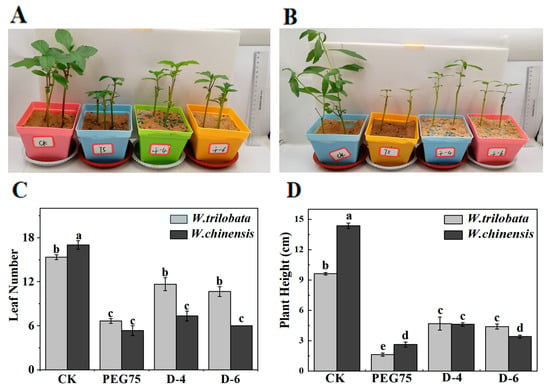 Effects of simulated drought stress on the growth of W. trilobata and W. chinensis (A). Growth phenotype of W. trilobata. (B) Growth phenotype of W. chinensis. (C) The effect of simulated drought stress on number of leaves of two plants. (D) The effect of simulated drought stress on plant height of two plants (mean ± SE, n = 3). Different lowercase letters in the figure indicate significant differences between different treatments (p < 0.05).