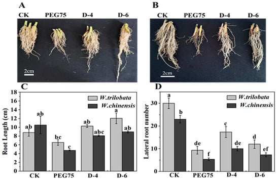 The influence of simulated drought stress on root growth in W. trilobata and W. chinensis was examined. (A) Root growth in W. trilobata. (B) Root growth in W. chinensis. (C) Root growth in both W. trilobata and W. chinensis. (D) Number of lateral roots in the two plants (mean ± standard error, n = 3). The lowercase letters in the figure denote significant differences observed between the treatments (p < 0.05). CK: the conditions of natural drought simulation, PEG75: Polyethylene glycol, D-4: water applied after four days, D-6: water applied after six days.