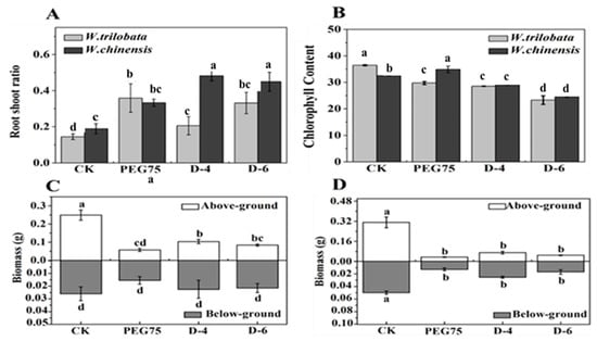 The effects of simulated drought stress on the root–shoot ratio (A), chlorophyll content (B), and biomass of W. trilobata (C), and biomass of W. chinensis (D) (mean ± S.E., n = 3). Different lowercase letters in the figure indicate significant differences between different treatments (p < 0.05).