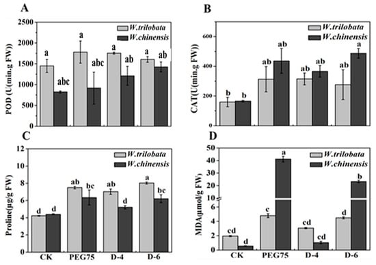 The impacts of simulated drought stress on peroxidase (A), catalase (B), proline (C), and malondialdehyde (D) in the leaves of the two plants were examined (mean ± standard error, n = 3). Distinct lowercase letters in the figure represent significant differences observed between the different treatments (p < 0.05).