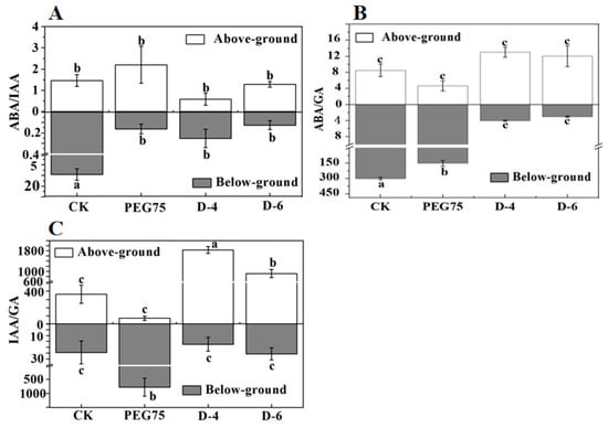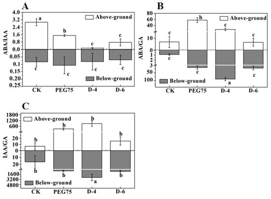 Effects of simulated drought stress on the ABA/IAA (A), ABA/GA (B), and IAA/GA (C) ratios in both the aboveground and underground parts of W. trilobata. The data presented represent the mean values with standard errors (mean ± standard error, n = 3). In the figure, lowercase letters are used to indicate significant differences observed between the treatments (p < 0.05).