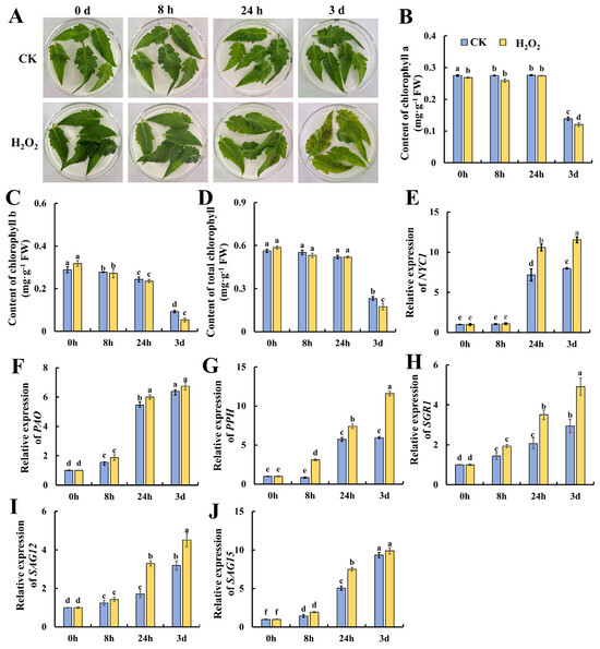 Accelerated senescence of tomato leaves by hydrogen peroxide treatment leads to reduced chlorophyll levels and the up-regulation of the expression of genes related to chlorophyll degradation. (A) Phenotypic changes in tomato leaves at 0 h, 8 h, 24 h and 3 d after treatment. Changes in (B) chlorophyll a, (C) chlorophyll b and (D) chlorophyll content, and the gene expressions of (E) NYC1, (F) PAO, (G) PPH, (H) SGR1, (I) SAG12 and (J) SAG15 at different treatment times and in different treatment groups. Data are expressed as mean ± SD (n = 3), and significant differences at the level of p < 0.05 are indicated with different letters.