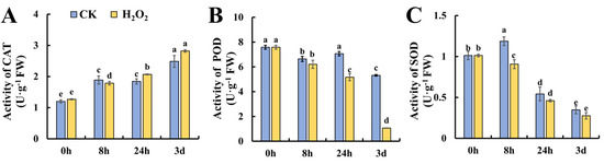To further investigate the changes in ROS metabolism under H2O2 treatment, the enzymes responsible for ROS metabolism were studied at the activity level. The first line of defense against ROS in plants is SOD, which converts O2•− to H2O2. In addition, POD and CAT are actively involved in the decomposition of H2O2 into H2O and O2•− [18]. As shown in Figure 3A, the activity of CAT increased gradually during leaf storage and no significant difference was found between the control and H2O2 treatment. Figure 3B shows the changes in POD activity during leaf senescence; it was found that POD exhibited a decreasing trend and H2O2 treatment caused significantly lower POD activity at 24 h and 3 days of storage. Figure 3C shows that the SOD activity increased slightly at 8 h in the control leaves, whereas the increase was attenuated in H2O2-treated leaves followed by a decrease in both the control and H2O2 treatment. Generally, H2O2 caused the decreased activity of POD and SOD during tomato leaf senescence, which may contribute to earlier senescence in H2O2-treated leaves.