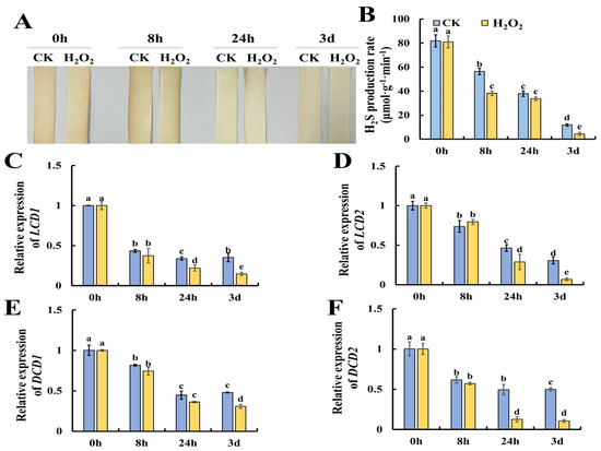 Previous research suggests that H2S could alleviate postharvest senescence in horticultural products by repressing the accumulation of ROS [16]. However, whether H2O2 could modulate H2S metabolism is still not clear. Thus, we evaluated the changes in the content of H2S in H2O2-treated tomato leaves during storage. Figure 4A shows the results of H2S production evaluated by lead acetate H2S detection strips, and the results showed that H2O2 treatment caused lower H2S contents especially at 8 h of H2O2 treatment. Furthermore, Figure 4B shows that H2O2 treatment resulted in a significantly lower rate of H2S production compared to the control. DCD is a key enzyme in the production of H2S using D-Cys as the substrate, while LCD catalyzes the decomposition of L-Cys to H2S, ammonia (NH4+) and pyruvate [19,20]. Then, we determined the expression of H2S-related metabolism genes, including LCD1, LCD2, DCD1 and DCD2. As shown in Figure 4C, the expression of LCD1 and LCD2 showed a decreasing trend during leaf senescence and H2O2 treatment caused significantly lower expression at 3 days of storage. Additionally, the expression of DCD1 and DCD2, which catalyze the production of H2S with D-cysteine as the substrate, were also determined. As shown in Figure 4E, F, a similar decreasing trend in the expression of DCD1 and DCD2 was observed, and H2O2 was found to reduce DCD1 expression at 3 days and DCD2 expression at 24 h and 3 days. Thus, we concluded that H2O2 could repress the generation of H2S by reducing the expression of LCD1/2 and DCD1/2.
