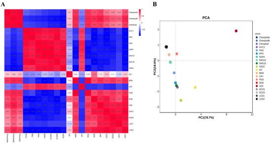 (A) Correlation analysis among the parameters of chlorophyll a, chlorophyll b, chlorophyll, H2O2, MDA, the production of O2•− and H2S, and the gene expressions of NYC1, PAO, PPH, SGR1, SAG12, SAG15, DCD1, DCD2, LCD1 and LCD2 in tomato leaves at 0, 8, 24 h and 3 d after H2O2 and H2O treatments. The correlation indexes are as follows: “+” indicates a positive correlation, “−” indicates a negative correlation, 0.8–1 indicates a high correlation, 0.6–0.8 indicates a strong correlation, 0.4–0.6 indicates a moderate correlation and 0.2–0.4 indicates a moderate correlation. (B) PCA of the testing indicators in tomato leaves at 0, 8, 24 h and 3 d after H2O2 and H2O treatments. PC1 and PC2, respectively, represent the contribution rate of principal components.