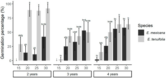 Effects of seed age and temperature on the germination of E. mexicana and E. tenuifolia. Mean germination percentages (±SD) at four different germination temperatures (15, 20, 25, and 30 °C) of seeds at different ages (two, three, and four years). Different letters indicate significant differences between treatments according to contrast tests (Tukey HSD, p ≤ 0.05). In all treatments, n = 10.