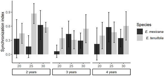 Germination synchrony indexes in E. mexicana and E. tenuifolia for seeds at different ages and under different temperatures. The synchrony index ranges from zero (seeds germinate on different days) to one (all seeds germinate on the same day). There were no significant differences between treatments. In all E. tenuifolia treatments, n = 10. E. mexicana treatments were performed on two-year-old seeds at 20 °C, n = 5, at 25 °C, n = 2, and 30 °C, n = 9; three-year-old seeds at 20 °C, n = 9, at 25 °C, n = 9, and 30 °C, n = 10; and four-year-old seeds at 20 °C, n = 9, at 25 °C, n = 10, and 30 °C, n = 10.
