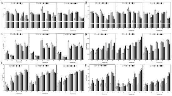 The effects of GA3, SA, and ETH on the nutrient content, antioxidant enzymes, and MDA of Hydrangea paniculata ‘Vanilla Strawberry’ leaves. (A–C) are the effects of GA3, SA, and ETH on soluble sugar (SS), soluble starch (SSt), and soluble protein (SP) of Hydrangea paniculata ‘Vanilla Strawberry’, respectively; (D–F) are the effects of GA3, SA, and ETH on MDA, SOD, and POD of Hydrangea paniculata ‘Vanilla Strawberry’, respectively. The different letters indicate significant difference among treatments (p ≤ 0.05).