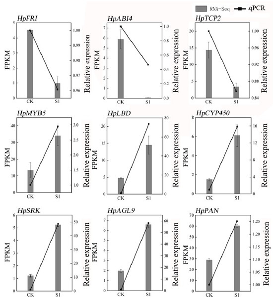 qPCR validation of RNA-seq data in Hydrangea paniculata ‘Vanilla Strawberry’. The nine genes in the figure are nine flowering-related genes randomly selected from the transcriptome database.
