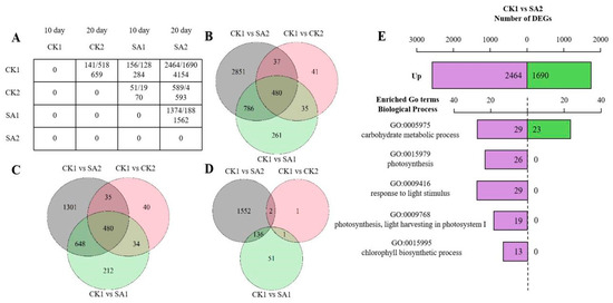 In the RNA-seq analysis, a gene expression matrix was constructed to compare different conditions—CK1, CK2, SA1, and SA2—across two developmental stages of 10 and 20 days. Figure 3A displays the count of upregulated and downregulated genes, along with the total DEGs, highlighting the dynamic changes in gene expression during flower development. This matrix reveals significant transcriptomic alterations, with CK1 and SA2 at 20 days showing a total of 4154 DEGs. Venn diagrams (Figure 3B–D) illustrate the overlap and uniqueness in gene expression profiles across different comparisons. A shared core of 480 genes was identified, suggesting the involvement of conserved genetic pathways in flower development. The analysis also delineates upregulated and downregulated DEGs, indicating condition-specific gene regulation. The enrichment analysis (Figure 3E) identifies genes involved in key biological processes such as carbohydrate metabolism and photosynthesis, highlighting the interaction between genetic regulation and environmental factors.