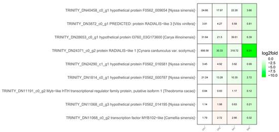 Co-transcription factors of the nine identified MYB genes. The color scale represents values of log2fold. The magnitude of downregulation is represented by the depth of green shading in the expression data. Dark green represents a larger downregulation, and light green represents a smaller downregulation.