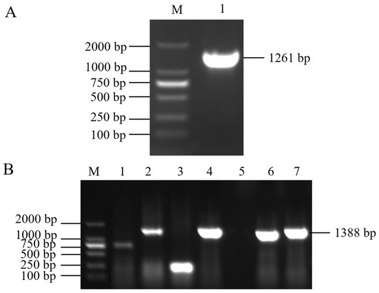 Agarose gel electrophoresis picture. (A) Cloned cDNA fragment of SlMYB86-like gene. M: Mark DL 2000, 1: SlMYB86-like gene. (B) Vector construction. M: Mark DL 2000; 2, 4, 6, 7: Positive clone; 1, 3, 5: Negative clone.