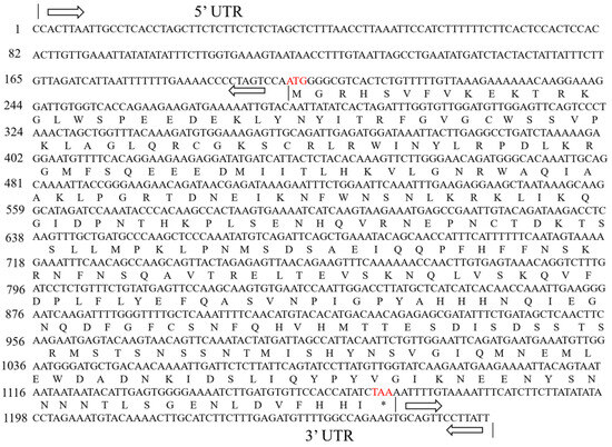 To obtain full-length cDNA of SlMYB86-like, Primer Premier 5 software was used to design a pair of specific primers (SlMYB86-like F/R: CCACTTAATTGCCTCACCTA GC/AATAAGGAACTGCACTTCTGGC). cDNA from the leaves with a high susceptibility to bacterial wilt (BY 1-2 (S)) was used as the template for PCR amplification. A PCR was conducted using an Applied Biosystems 2720 Thermal Cycler (Applied Biosystems, Waltham, MA, USA). PCR reactions were conducted in a volume of 20 μL with the following components: 10 μL of 2× Taq Master Mix (Vazyme, Nanjing, China), 1 μL of template cDNA (100–200 ng/μL), 1 μL of each forward and reverse primer (10 mmol/L), and 7 μL of sterilized double distilled water (ddH2O). The thermal cycling conditions were as follows: 95 °C for 3 min (pre-denaturation); 30 cycles of 95 °C for 30 s (denaturation), 55 °C for 30 s (annealing), and 72 °C for 1 min 20 s (extension); and 72 °C for 10 min (final extension). PCR products were separated on a 1% agarose gel in 0.5× trisborate-EDTA buffer and purified using a Star Prep Fast Gel Extraction Kit (GenStar, Beijing, China). The purified PCR products were cloned into the pMD19-T vector (Takara, Beijing, China). The universal primer (pMD19-F/R: CGCCAGGGTTTTCCCAGTCACGAC/CGCCAGGGTTT TCCCAGTCACGAC) was used to detect the PCR products. The positive clones were sent to Sangon Biotech (Shanghai, China) for sequencing.