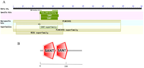 Prediction of SlMYB86-like protein domain. (A) Conservative domain of SlMYB86-like protein. (B) Prediction analysis results of SlMYB86-like protein structure.