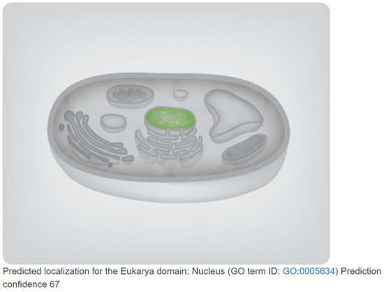 Electrophoretic bands of 1261 bp were cloned via PCR from BY 1-2 (S) tomato seedlings (Figure 1A); the size of the bands was consistent with the expected size of the target gene fragment. The PCR-amplified products were recovered, purified, and cloned into the pMD19-T vector (Figure 1B). The sequencing results revealed that the SlMYB86-like gene was 1261 bp, with an open reading frame (ORF) of 966 bp and encoded a protein with 321 amino acids (starting at 201 bp and ending at 1166 bp) (Figure 2). A BLAST search of the cDNA sequence of the SlMYB86-like gene against the tomato genome (ITAG release 4.0) was performed and assigned the Gene Accession number Solyc06g071690. A conserved domain analysis revealed that SlMYB86-like contains the MYB DNA-binding domain, as well as the PLN03091, REB1, and SANT structure domains (Figure 3A). Furthermore, SMART online program prediction showed that the SlMYB86-like protein had two typical SANT-MYB domains located at amino acids 13–63 and 66–114 (Figure 3B). A PredictProtein online program prediction showed that SlMYB86-like was localized to the nucleus (Figure 4).