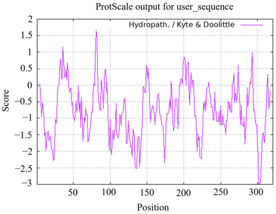 ProtParam analysis revealed that the molecular formula of the protein was C1626H2511N467O498S15, the molecular weight of the protein was 37.05055 kDa, the theoretical isoelectric point was 7.22, the total number of negatively charged residues (Asp + Glu) was 36, and the total number of positively charged residues (Arg + Lys) was 36. The aliphatic index was 67.38, the instability index was 47.44, and the grand average of hydropathicity was −0.754, indicating that the protein was hydrophilic (Figure 6). In sum, the protein is a weakly alkaline and unstable hydrophilic protein. The SignalP 6.0 and TMHMM Server v.2.0 online programs were used to analyze the signal peptides and transmembrane domains of tomato SlMYB86-like protein, respectively. SlMYB86-like did not contain signaling peptides, indicating that it is a nonsecretory protein; it also did not contain transmembrane structures (Figure 7).
