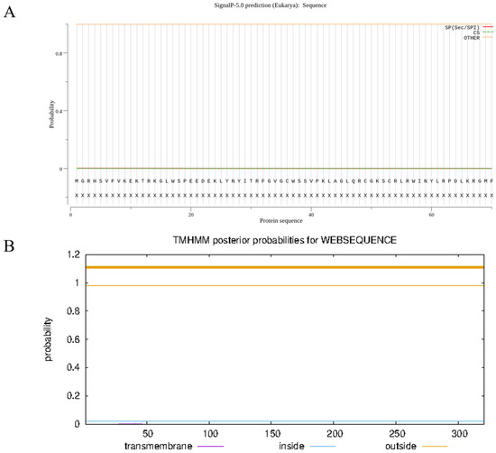 Signal peptide and transmembrane structure prediction of SlMYB86-like protein. (A) Signal peptide prediction of SlMYB86-like protein. (B) Transmembrane structure prediction of SlMYB86-like protein.