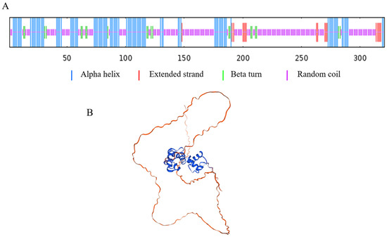 Secondary structure and tertiary structure prediction of SlMYB86-like protein. (A) The secondary structure prediction of SlMYB86-like protein. (B) The tertiary structure prediction of SlMYB86-like protein.