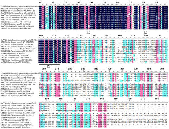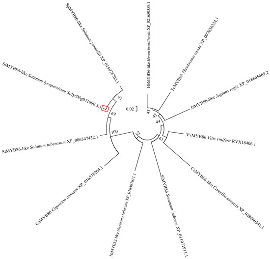 The protein sequences of 10 species (e.g., Solanum pennellii, Solanum tuberosum, Capsicum annuum, and Nicotiana tabacum) with high homology to SlMYB86-like in tomato were obtained via a BLAST search against the National Center for Biotechnology Information (NCBI) database. The 11 SlMYB86-like proteins all contained an R2 and R3 MYB domain, indicating that they were all R2R3-MYB TFs (Figure 9). Phylogenetic trees were constructed using MEGA6.0 software, and SlMYB86-like (tomato) was the most closely related to SpMYB86-like (S. pennellii) and StMYB86-like (S. tuberosum) and most distantly related to the homologous proteins in Theobroma cacao and Hevea brasiliensis (Figure 10).