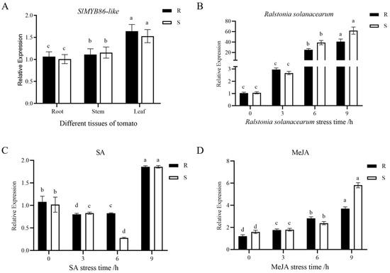 Expression analysis of tomato SlMYB86-like gene. (A) Expression of SlMYB86-like gene in different tomato tissues. (B) Expression of SlMYB86-like gene under stress of Ralstonia solanacearum. (C) Expression of SlMYB86-like gene under exogenous hormone SA treatment. (D) Expression of SlMYB86-like gene under exogenous hormone MeJA treatment. n = 3, the different lowercase letters represent significant differences (p < 0.05).