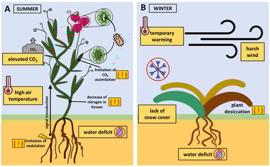 Examples of the implications of the simultaneous impact of many stress factors on crops. (A) Soil water deficit triggers signals from roots to shoots. Consequently, the stomata in the leaves close. However, high air temperatures stimulate stomatal opening in flowers. Stomatal closure limits pathogen transmission, while open stomata present a potential route of infection for weakened plants due to unfavorable environmental conditions. In plants with C3 photosynthesis, elevated concentrations of CO2 (e[CO2]) in the atmosphere do not stimulate carbon assimilation. Drought and e[CO2] disturb legume nodulation and lead to a decrease in nitrogen in tissues. (B) The lack of rainfall in autumn may result in water deficiency in the soil during winter. Winter crops may experience temporary warming in the middle of winter, causing the plants to reduce their winter hardiness due to the deacclimation process. The accompanying lack of snow cover and harsh winds result in the desiccation of plants.