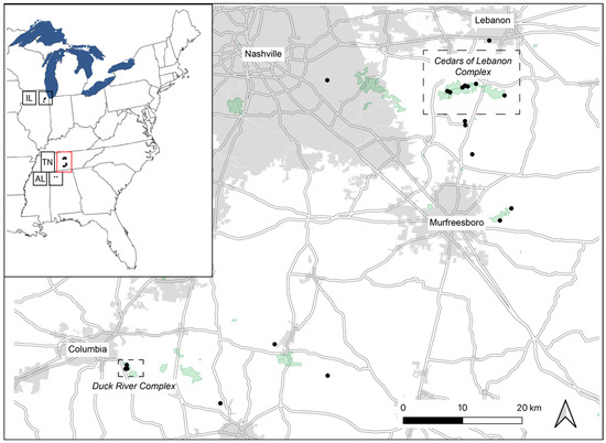 As with the Cedars of Lebanon Complex, the Duck River Complex appears to form a tight genetic cluster, while the more geographically isolated sites in the same region appear to reflect distinct clusters, which could be a consequence of the geographic distance between locations there (Figure 3 and Figure 4; Supplemental Table S3). Distances between sampled sites within the Duck River Complex are quite limited (~350–800 m), with sites in the region being separated by 11 to 70 km, in contrast to distances between 550 m and 5 km between neighboring sites in the Cedars of Lebanon Complex.