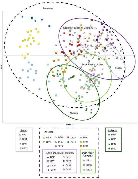 The lowest pairwise population FST values were between populations within the Cedars of Lebanon Complex in Tennessee (FST = 0.008 for DF30 and DF20) and between populations within Illinois (FST = 0.017 for DF01 and DF08). The highest pairwise population FST values were consistently between Alabama population DF15 and populations from Tennessee (DF32, FST = 0.981) and Illinois (DF01, FST = 0.966). All pairwise population FST values are provided in Supplemental Table S3. With respect to PCoA results based on the analysis of individuals, 20.64% of the observed variation was explained by the first axis, 34.72% by the first and second axes combined, and 45.66% by all three axes combined. The PCoA results for axes one and two are presented in Figure 2 These results indicate a considerable overlap among populations within the Cedars of Lebanon Complex in Tennessee; there is also a considerable overlap among populations within the Duck River Complex. Illinois populations fall within the space of Tennessee populations, primarily in the area of the Cedars of Lebanon Complex, while Alabama populations exhibit more differentiation but still overlap with Tennessee populations, primarily in the Duck River Complex. Similar but slightly different patterns were observed for PCoA based on populations (see Supplemental Figure S1). There is greater differentiation between Alabama and Tennessee, although Illinois and Tennessee still show some overlap. The results of the Mantel test support isolation by distance with a p-value of 0.010.